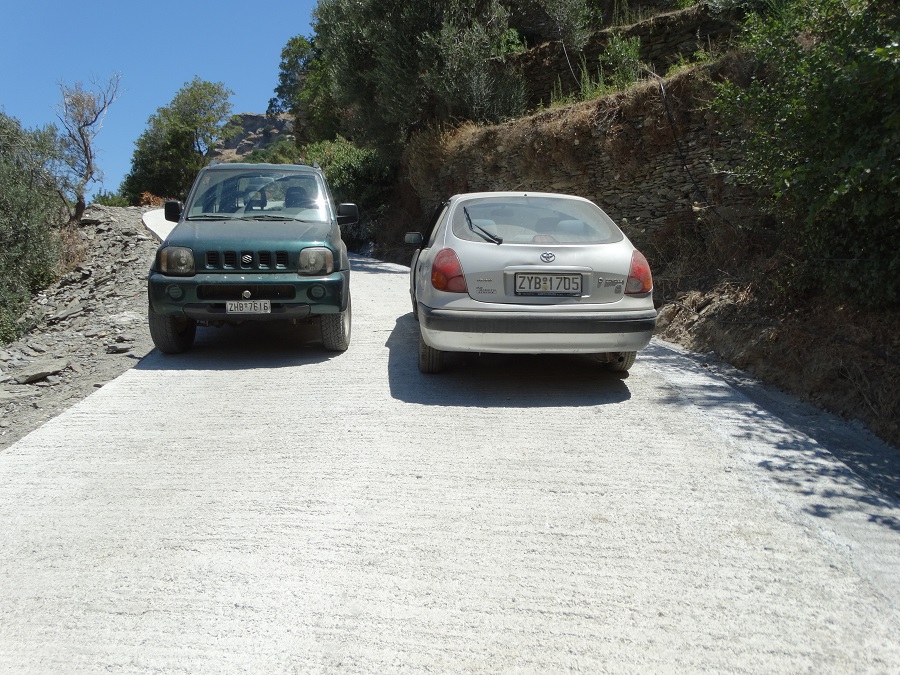 Απτή απόδειξη της διασταύρωσης δύο αυτοκινήτων αυτή η φωτογραφία. Βεβαίως το "σκαλάκι" με το μπετό αριστερά ενέχει ακόμα κάποιον κίνδυνο. Όμως τουλάχιστον γίνεται το προσπέρασμα όσων έρχονται αντίθετα (φωτο: Εν Άνδρω).