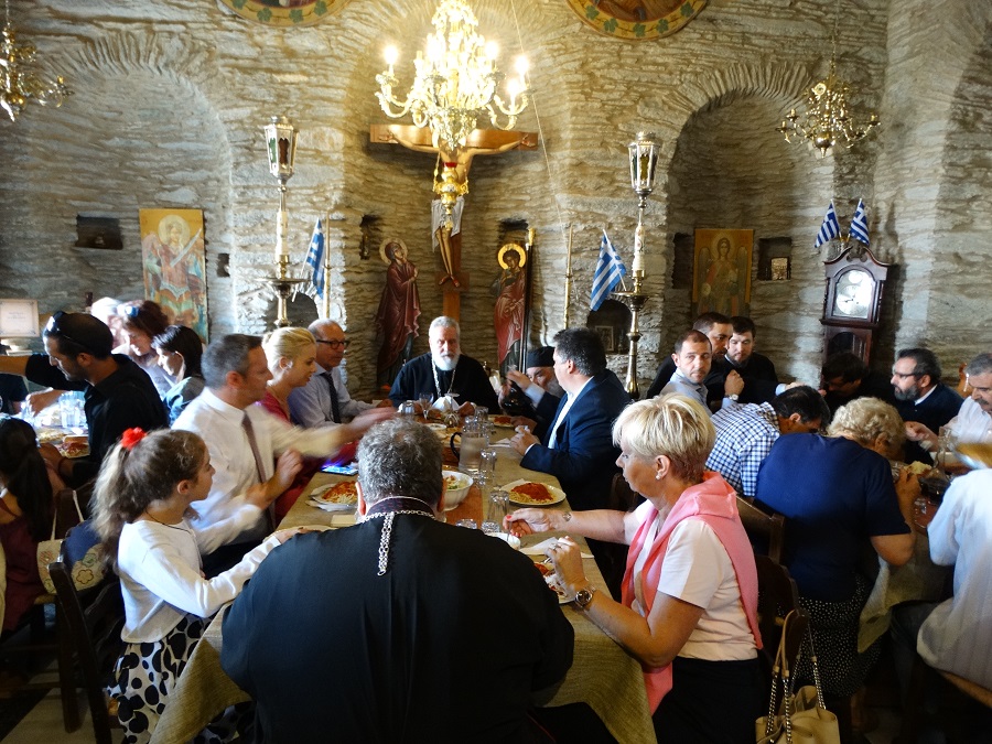 Στο γεύμα το τραπέζι των επισήμων μέρα που ήτανε. Από αριστερά διακρίνονται: ο αντιδήμαρχος Οικονομικών, η πολιτευτής της ΝΔ, ο αντιπεριφερειάρχης Κυκλάδων, ο μητροπολίτης, ο ηγούμενος, ο έπσρχος και η π. πρόεδρος του ΔΣ Άνδρου. Με την πλάτη ο εφημέριος του Όρμου Κορθίου (φωτο: Εν Άνδρω).