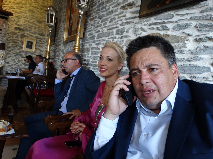 Στο ηγουμενείο για καφέ μετά την λειτουργία. Από αριστερά: ο αντιπεριφερειάρχης Κυκλάδων Γιώργος Λεονταρίτης, μιλά στο τλέφωνο (ο αντιπεριφερειάρχης ενδιαφέρεται και έρχεται πολύ συχνά στην Άνδρο), η πολιτευτής Κ. Μονογιού (που κι αυτή αν και Μυκονιάτισα έρχεται εξίσου συχνά στην Άνδρο) και ο έπαρχος Άνδρου Δημήτρης Λοτσάρης, μιλά κι αυτός στο τηλέφωνο (φωτο: Εν Άνδρω).