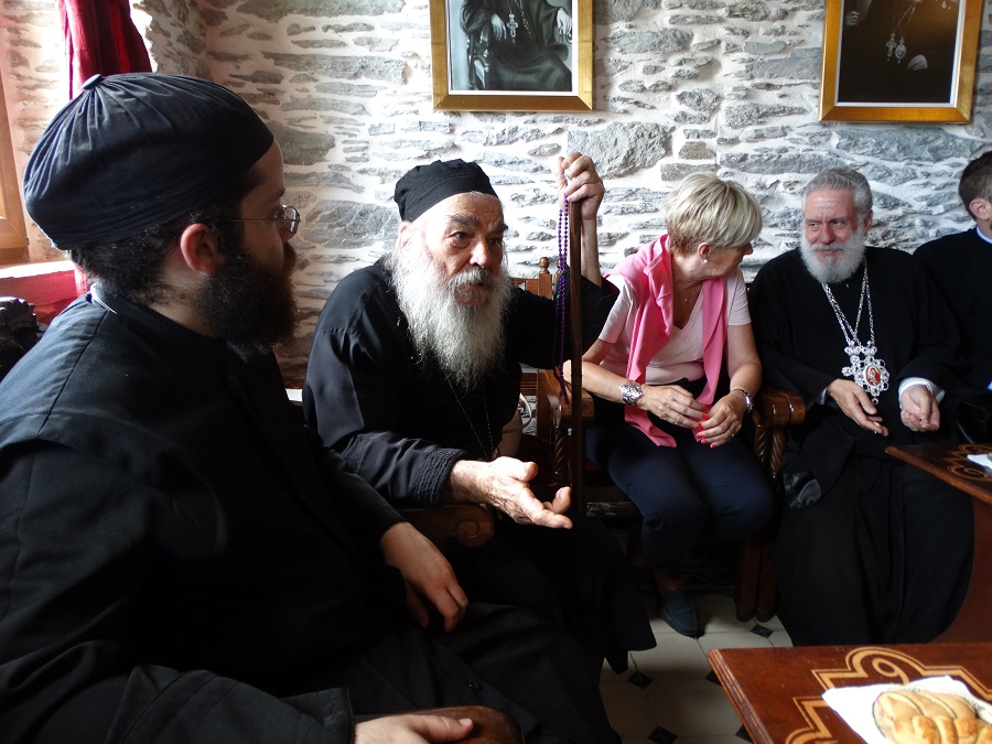 Μια στιγμή κουβέντας την ώρα τουκαφέ. Ο νεαρός διάκος Ευδόκιμος παρακολουθεί, ο ηγούμενος γέροντας Ευδόκιμος εξηγεί, η πρώην πρόεδρος του ΔΣ Άνδρου Μ. Βενετίκη και ο μητροπολίτης Δωρόθεος ΙΙ συζητούν (φωτο: Εν Άνδρω).