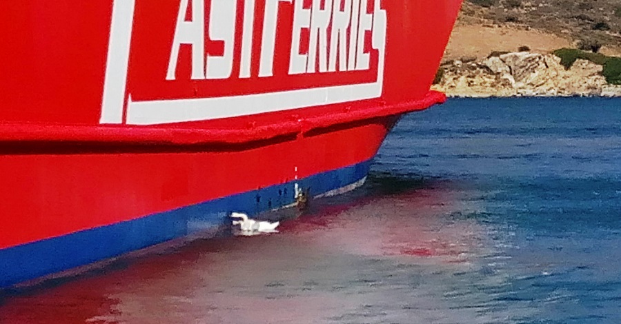 Οι δύο κύκνοι του Γαυρίου έχουν πλησιάσει το πλοίο της γραμμής και παίζουν με αυτό... (φωτο: Α.Σ. για το Εν Άνδρω).
