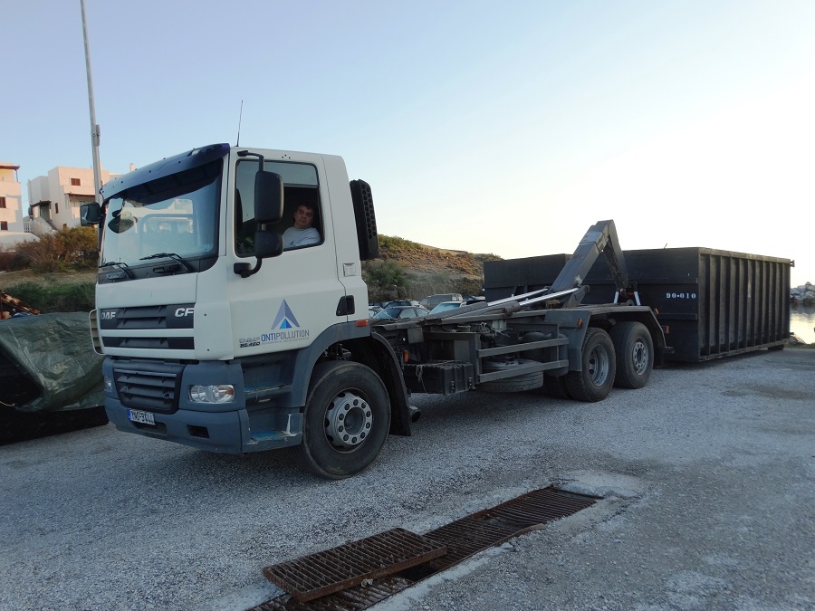 Το φορτηγό που μεταφέρει από το Καλυβάρι το μαύρο μκοντέινερ με ότι μαζεύουν τα συνεργεία από τις ακτές και την θάλασσα σε ειδικό χώρο στο Γαύριο. Εδώ ξηφορτώνει το κοντέινερ (φωτ. Εν Άνδρω).