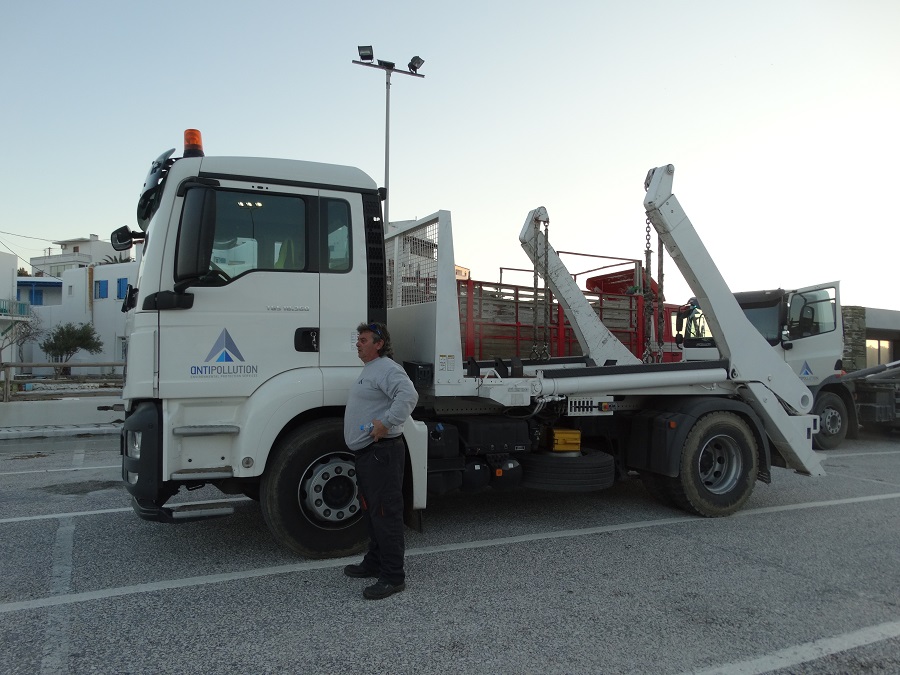 Άλλη  μια φωτογραφία των δύο ειδικών φορτηγών - και του οδηγού - που μεταφέρουν τα κοντέινερ με τα υλικά, αλλά και τα κοντέινερ με τα σκουπίδια της ρύπανσης στο Γαύριο (φωτ. Εν Άνδρω).