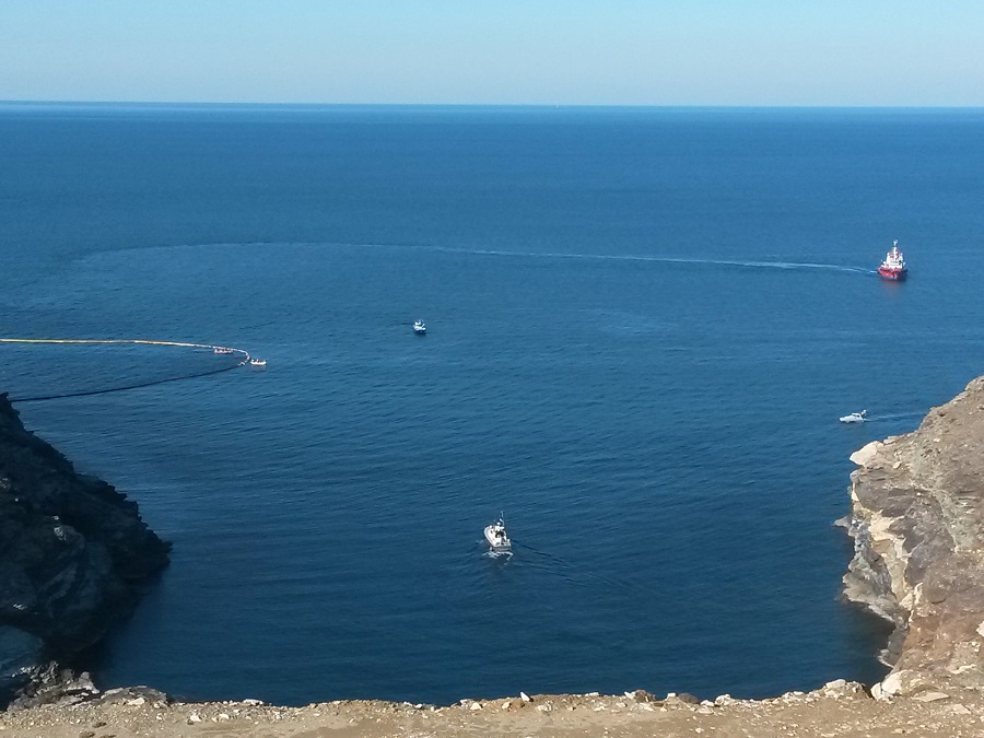 Έτσι, λοιπόν, αν κάποιος φθάσει κοντά στο σημείο του ναυαγίου θα δει θαλασσια φράγματα απορρύπανσης πετρελαίου και γύρω ρυμουλκά, απορρυπαντικά σκάφη, δύτες, καταδυτικά μηχανήματα και συνεργεία καθαρισμού των ακτών. Αλλά επίσης θα δει πλωτά και επίγεια μέσα του Λιμεναρχείου Άνδρου. Όλοι μαζί από τις 8 κάθε πρωί μέχρι να νυχτώσει, δίνουν μάχη με το πετρέλαιο να αντλήσουν από το βυθισμένο πλοίο και να καθαρίσουν από τα κατάλοιπα του τις ακτές.