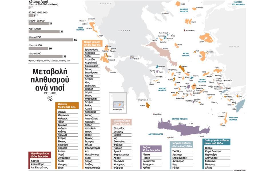 Μεγαλύτερο πληθυσμό το 2011 σε σχέση με το 1951 έχουν μόνο η Κρήτη, η Εύβοια, η Ζάκυνθος και ακόμα 8 νησιά. Τη μεγαλύτερη μείωση πληθυσμού στα τελευταία 60 χρόνια καταγράφει ο Νομός Λέσβου (-33%).
