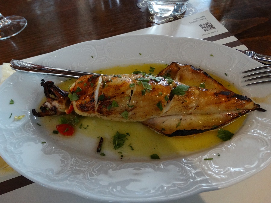 Το φαγητό, σπεσιαλιτέ του καταστήματος, έφτασε: ψητό καλαμαρι, γεμιστό με ντόπιο τυρί και κόκκινη πιπεριά! (φωτ. Εν Άνδρω).