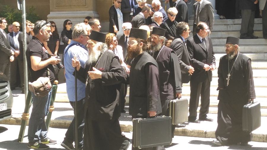 Πλήθος κόσμου στον Άγιο Διονύσιο Αρεοπαγίτη για την εξόδιο ακολουθία του Αλέκου Γουλανδρή (φωτ. Εν Άνδρω).