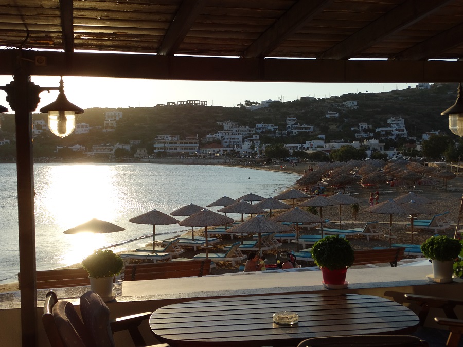 Το κάδρο από την βεράντα του Ευτύχη. Με τα ρολόγια, τα ασημικά και τα χρυσαφικά του. Περιμένει τους πελάτες με μερικές γλάστρες βασιλικούς και θέα την παραλία όπου οι τελευταίοι κολυμβητές δεν λένε να φύγουν. Και γιατί να φύγουν όσο υπάρχει φως; (φωτ. Εν Άνδρω).