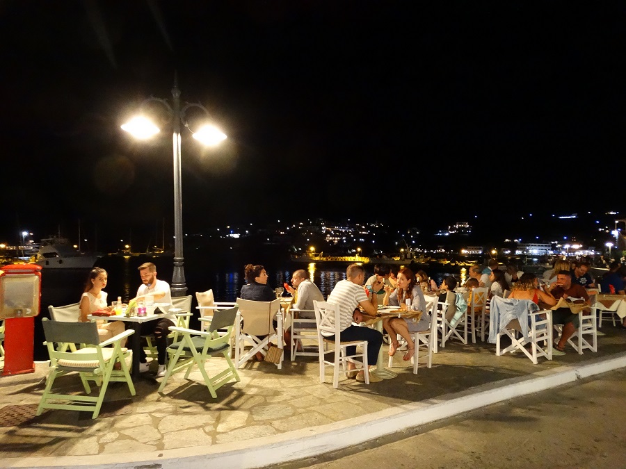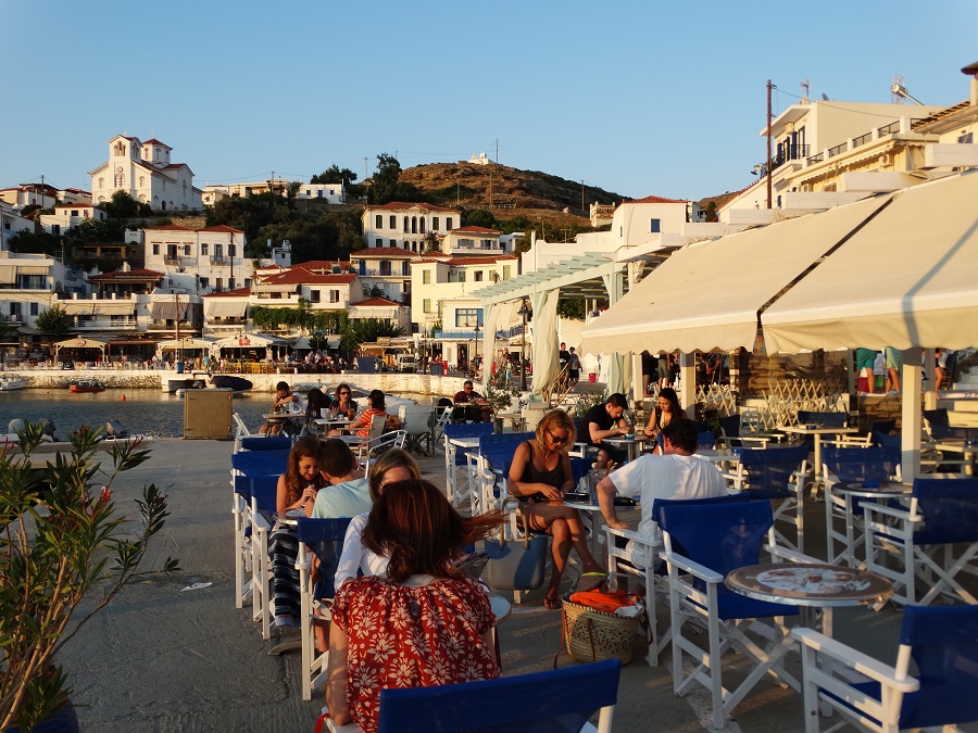 Οι τουρίστες είναι εδώ. Μαζί και οι εκδρομείς του Σαββατοκύριακου από Αττική. Απολαμβάνουν τον ήπιο απογευματινό ήλιο και την ομορφιά του δειλινού. Τα τραπεζάκια έξω στην προβλήτα δίνουν το απαραίτητο χρώμα. Τι θα ήταν αυτή η εικόνα χωρίς τα τραπεζάκια και τους ανθρώπους που χαλαροί απολαμβάνουν τη δύση; (φωτ. Εν Άνδρω).