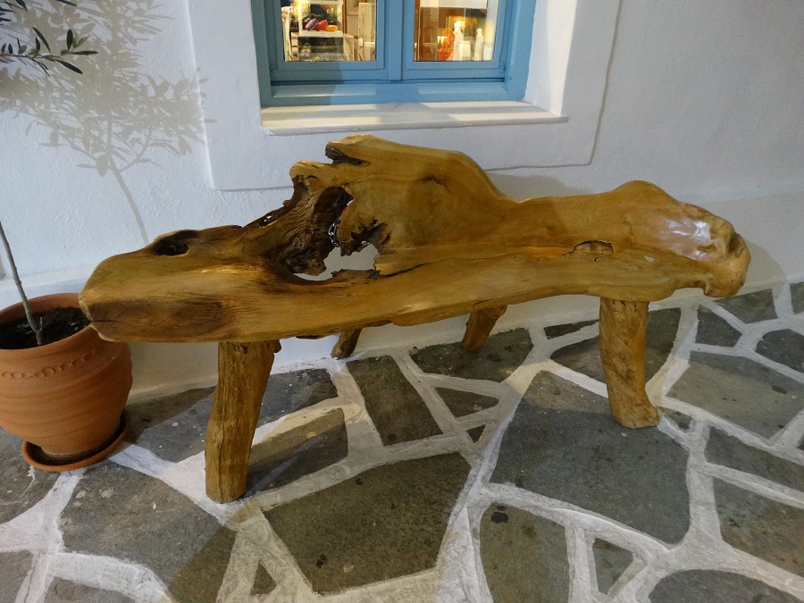 Μπροστά στην γκαλερί ένα μοναδικό παγκάκι. Έργο της φλυσης και του ανθρώπου. Η φύση έβαλε το υλικό: μια μεγάλη γέρικη ελιά. Ξύλο βαρύ, αισθαντικό, αθάνατο. Η φωτιά (η δύσκολη σχέση ανθρώπου και φύσης) έβαλε το τυχαίο. Κι από εκεί και πέρα ο άνθρωπος την έμπνευση. Ο ανώνυμος καλλιτέχνης σκάλισε τον κορμό με τέχνη και μεράκι. Κι έφτιαξε ένα υπέροχο παγκάκι για δύο άτομα. Εξαιρετικά ευσταθές και συμπαγές. Και βαρύ. Σύμβολο της γκαλερί. Με μια λέξη: ΜΟΝΑΔΙΚΟ!!! (φωτ. Εν Άνδρω).