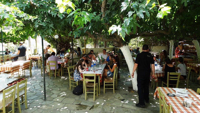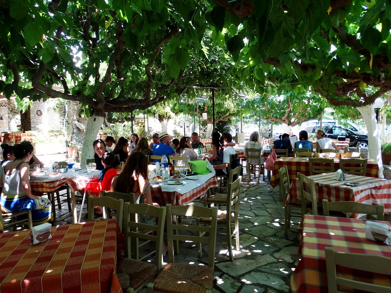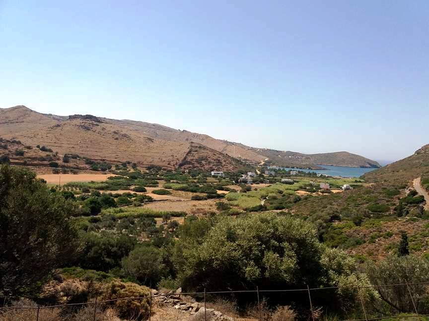 Στην μεση του μικρού κάμπου η ταβέρνα "το στέκι του Αντρέα". Πιο πράσινη από το πράσινο και πιο σκιερή από ποτέ με τις φουντωτές μουριές της. Μερικές μεγάλες παρέες ξαποσταίνουν στο καταμεσήμερο. Όλοι Γάλλοι!!! Μια γαλλική εξόρμηση στην Βόρεια Άνδρο. Όλοι με ενοικιαζόμενα αυοκίνητα. Όλοι οικογενειακώς. Όλοι ευγενικοί, ήσυχοι και διακριτικοί. Ήρθαν όλοι μαζί. Εκεί που η καταπράσινη ταβέρνα ήταν σχεεδόν άδεια άρχισαν να φτάνουν το ένα μετά το άλλο 10 αυτοκίνητα όλων των μεγεθών και ένα βανάκι!!! (φωτ. Εν Άνδρω).