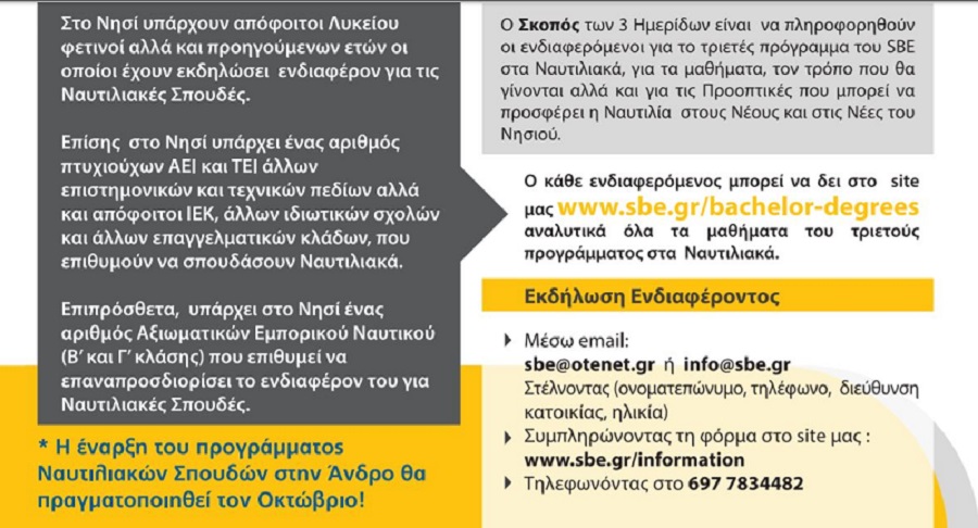 Σας προσκαλούμε στις Ημερίδες Ενημέρωσης, που έχουν ως στόχο να πληροφορήσουν τα παιδιά, τους γονείς και κάθε ενδιαφερόμενο για τις Ναυτιλιακές Σπουδές, και την δυνατότητα υλοποίησης τριετούς προγράμματος Ναυτιλιακών σπουδών στο νησί της Άνδρου.