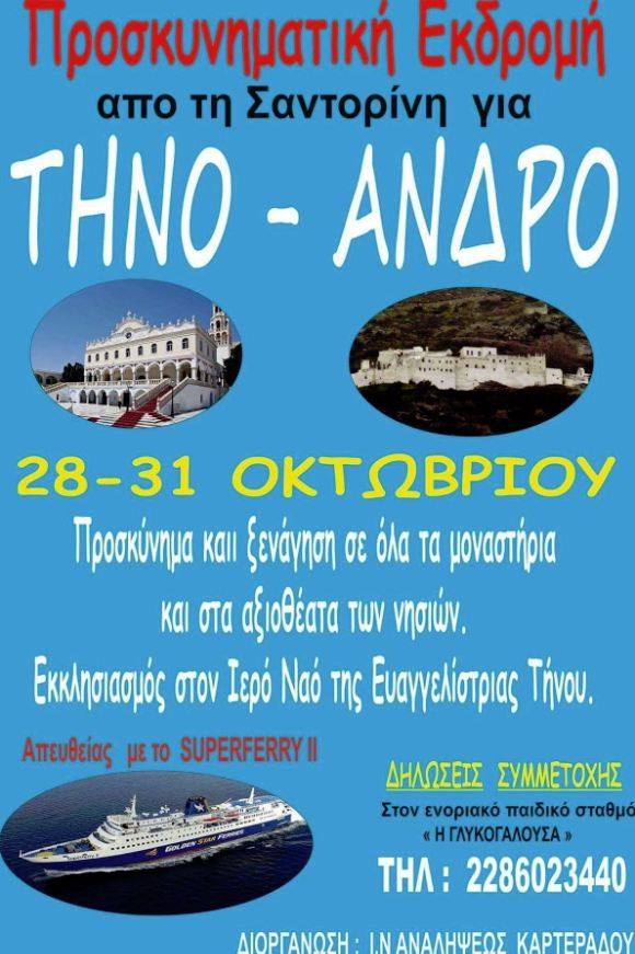 Μετά την παραπάνω ανακοίνωση επικοινωνήσαμε για περισσότερες πληροφορίες με την εταιρεία και μάθαμε πως ο πράκτορας τους στη Σαντορίνη σε συνεργασία με την εκκλησία διοργανώνουν προσκυνηματικό τουρισμό στην Τήνο και στην Άνδρο.