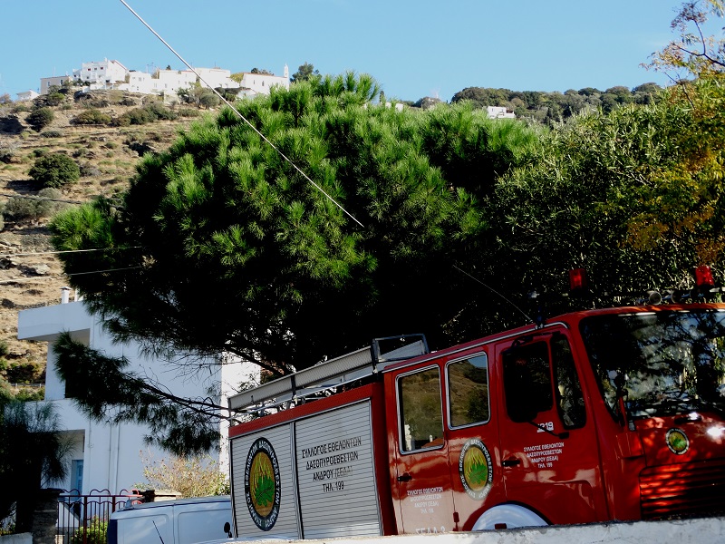 Ο Σύλλογος έχει 8 οχήματα. Τρία μεγάλα και τριά μικρά πυροσβεστικά. Ένα μεταφορά προσωπικού και μια υδροφόρα. Κανονικό σώμα της πυροσβεστικής οι άνθρωποι... (φωτ. Εν Άνδρω).