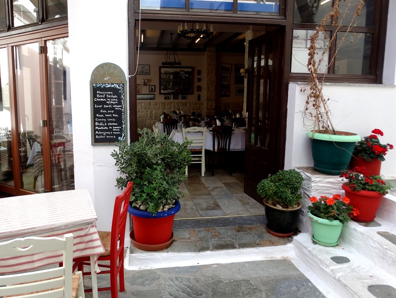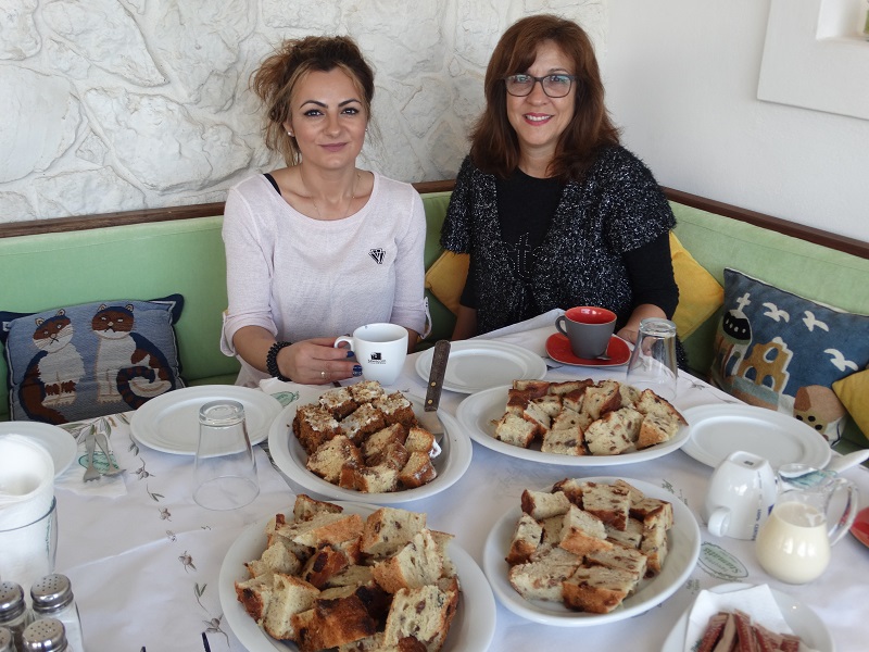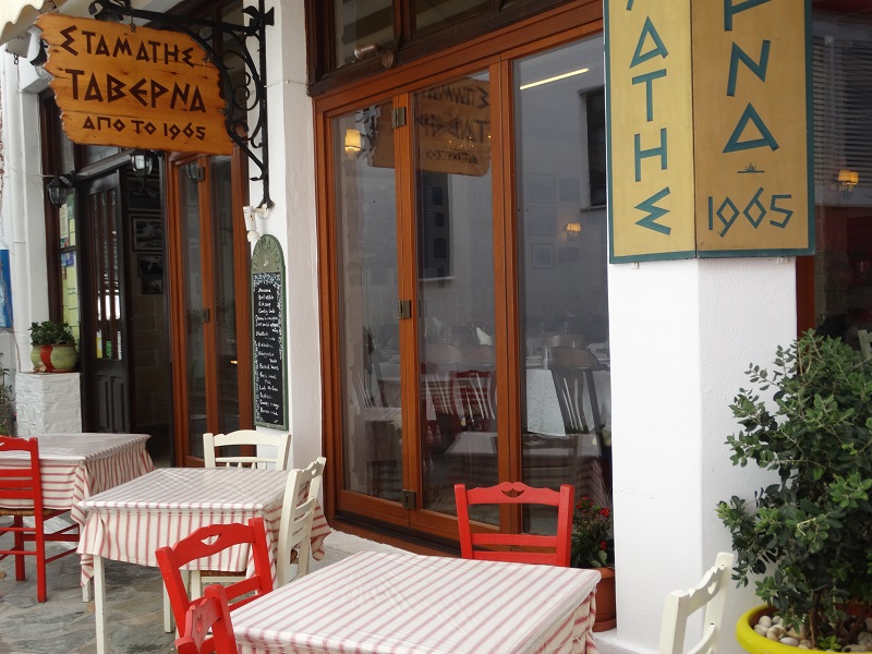 Δεξιά η σύζυγος του Γιάννη, Καλιρρόη, μπροστά στις ωραίες πίτες της. Γεννημένη στη Νέα Υόρκη κόρη του πρώην προέδρου του Μπατσιού Μιχάηλ Μουστάκα,. Να θυμίσουμε πως ο Μ. Μουστάκας ήταν ιδρυτής του συλλόγου Ανδρίων που έκανε έρανο και σκεπάστηκε το 1959. Μιλήσαμε στο μοκρό μπαλκόνι του "Σταμάτη" που βλέπει όλο το λιμάνι. "Κάνουμε προσπάθεια μένοντας ανοικτοί όλο τον χειμώνα. Είναι κρίμα να έρχονται επισκέπτες την χειμερινή περίοδο και να μην βρίσκουν τίποτα ανοικτό. Εμείς ακόμα και κάποιο βράδυ δεν έχουμε κόσμο μένουμε μέχρι 10:30-11:00. Πως θα γίνουμε προορισμός με μόνο 2-3 μήνες τον χρόνο ανοικτά τα μαγαζιά; Καλό θα ήταν να έμαναν κι άλλα μαγαζιά ανοικτά ώστε να υπάρχει και μια αναφορά και το χειμώνα στο Μπατσί" (φωτ. Εν Άνδρω).