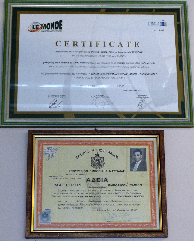 Δύο διπλώματα μαγειρικής. Η διαδρομή μιας ιστορικής ταβέρνας στο Μπατσί. Κάτω του παππού Σταμάτη Θωμά από το υπουργείο Ναυτιλίας. Πάνω του εγγονού Σταμάτη Θωμά από την "Le Monte".Κοντά μισό αιώνα απόσταση το ένα από το άλλο (φωτ. Εν Άνδρω).