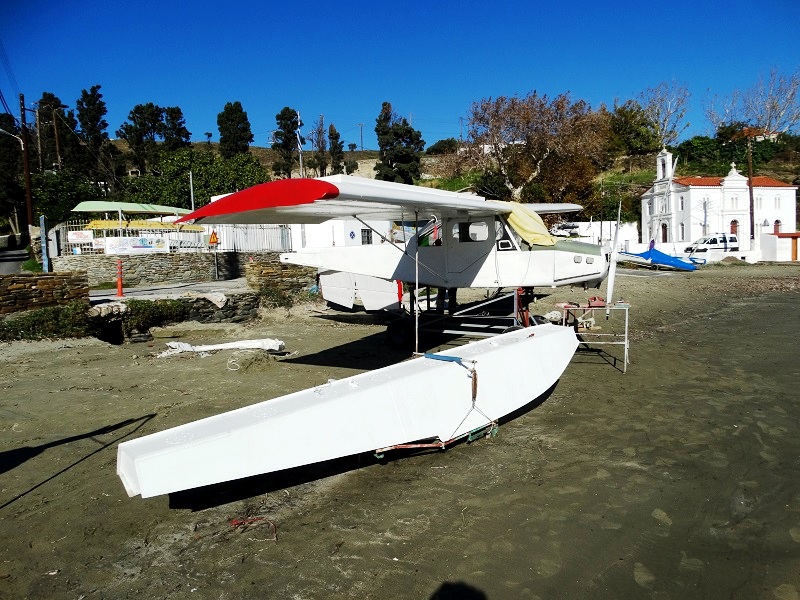 Η κατασκευή του υδροπλάνου από τον Κώστα ξεκίνησε πολλά χρόνια πριν. Επιταχύνθηκε από τον καιρό που πήρε σύνταξη. Το έφερε στο Νειμποριό δύο μέρες πριν τη δοκιμή και άρχισε να τοποθετεί τους πλωτήρες και το ουραίο φτερό στο σώμα του σκάφους. Όλα ολοκληρώθηκαν όλα το Σάββατο. Εδώ στη φωτογραφία του Εν Άνδρω το υδροπλάνο κατά την τελική σύνθεση του στο Νειμποριό δύο μέρες νωρίτερα από την δοκιμή.