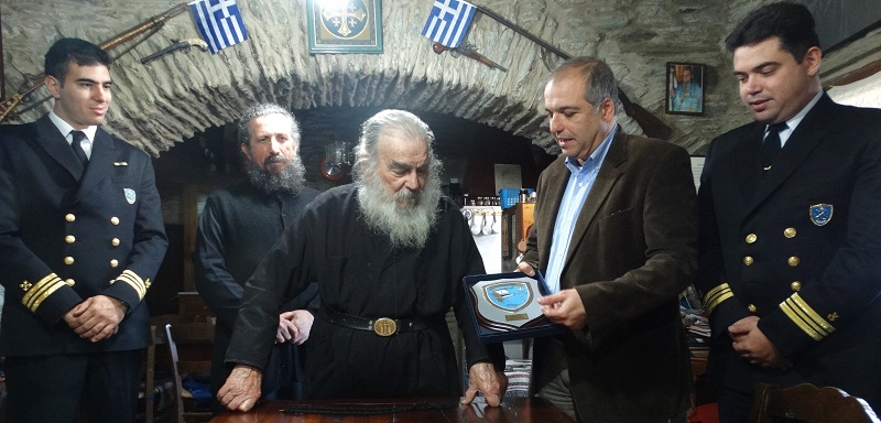 O Διοικητής της 6ης Περιφερειακής Διοίκησης Κυκλάδων Ν. Σκευοφύλαξ παραδίδει αναμνηστική πλακέτα στον Γέροντα Ευδόκιμο μετά το αποχαιρετιστήριο γεύμα του απερχόμενου Λιμενάρχη προς τον αναλαμβάνοντα στη Μονή Παναχράντου. Εικονίζονται από αριστερα: ο απερχόμενος Λιμενάρχης Γιώργος Σίδερης, ο πατήρ Αέτιος, ο Γέροντας Ευδόκιμος, ο Διοικητής Κυκλάδων Ν. Σκευοφύλαξ,ο νέος Λιμενάρχης Θόδωρος Κραψίτης (φωτ. Εν Άνδρω).