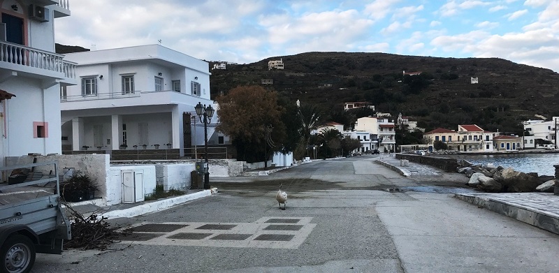 Όρμος Κορθίου. Ίδια μέρα λίγο αργότερα. Πριν το σούρουπο της χτεσινής Κυριακής. Δρόμοι άδειοι. Μόνο ένας κύκνος πεινασμένος βγήκε από τα κρύα νερά και ψάχνει κάτι να φάει στον δρόμο της παραλίας. Ο αναγνώστης που τράβηξε την φωτογραφία συμπλήρωσε: "την χαρά που έκανε όταν του έδωσα λίγο ψωμί". Στην πλατεία Καΐρη ήταν ο κυρ-Βασίλης που πόζαρε, στον Όρμο μόνο ενας κύκνος!!!... (φωτ. Χαρίδημος)