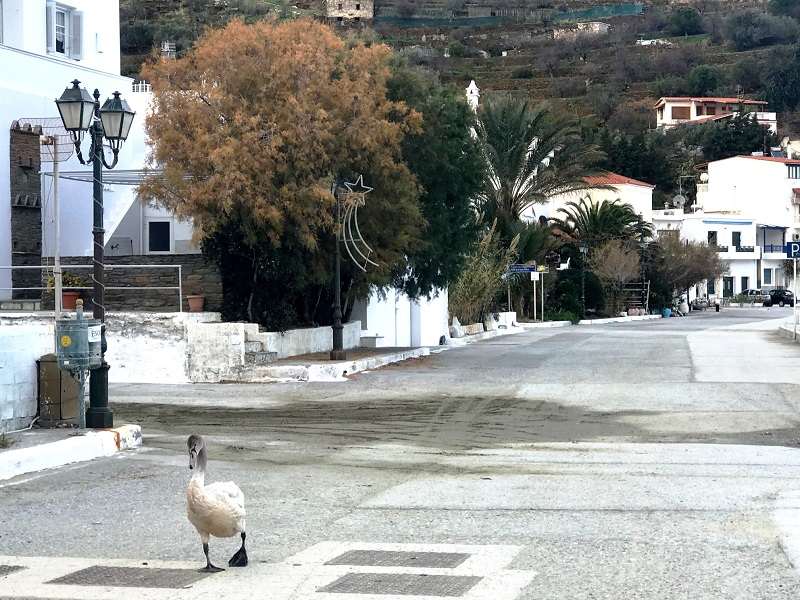 Ο κύκνος καθώς κατευθύνεται προς τον μοναδικό άνθρωπο που βλέπει στον άδειο δρόμο. Βγήκαν τα πετεινά της θάλασσας και του του ουρανού και ψάχνουν ανθρώπους πάνω στη γη... (φωτ. Χαρίδημος)