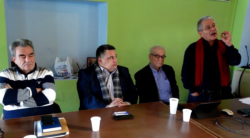 Ο καθηγητής Δημήτρης Μπουραντάς μιλά στους ακροατές του στο ΚΠΕ Κορθίου. Δίπλα του ο Νίκος Κουτσιανάς, ο έπαρχος και ο Γιώργος Δαρδανός (φωτ. Εν Άνδρω).