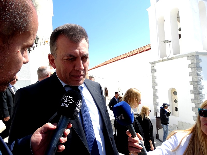 Στην νεκρώσιμη ακολουθία προσήλθε ο πρώην υπουργός και βουλευτής Κυκλάδων Γιάννης Βρούτσης. Εδώ κάνει δηλώσεις στον Αντένα και στο Σταρ (φωτ. Εν Άνδρω).