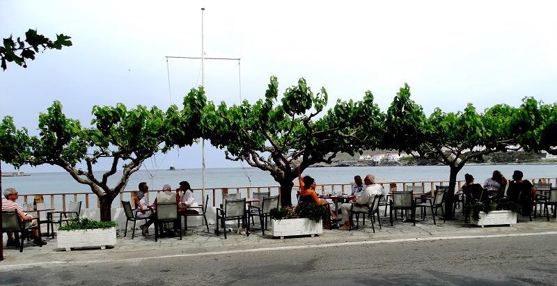 Λίγο πιο κάτω δυό-τρεις παρέες στον ιστορικό πλάτανο. Λίγοι οι επισκέπτες που βρέθηκαν στην μισοάδεια πλατεία Καΐρη. Για το καλό. Μια μεγάλη παρέα από το Μπατσί, που ήρθε εκδρομή στην Χώρα, διαπίστωσε το γνωστό σε όλους: «άλλος Θεός μετά την Σταυροπέδα»!!!