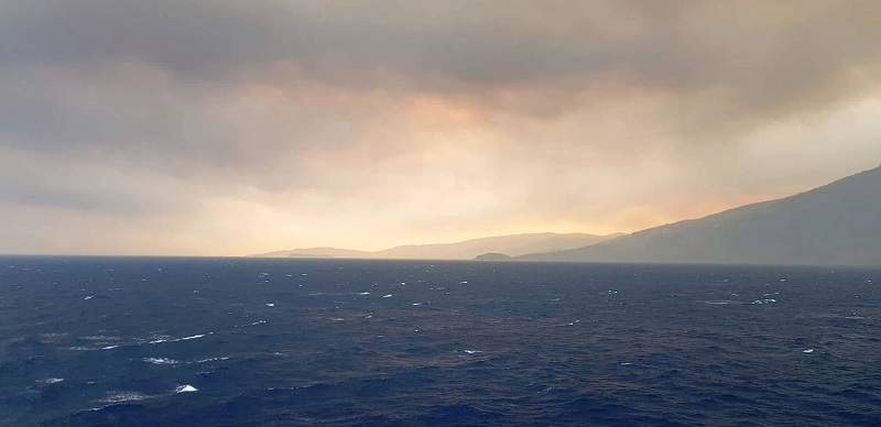 Η κάπνα και τα αποκαΐδια κατευθύνονται προς την Άνδρο. Φωτογραφία από την γέφυρα του Supoerferry (φωτ. συνεργάτη Εν Άνδρω).