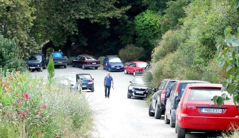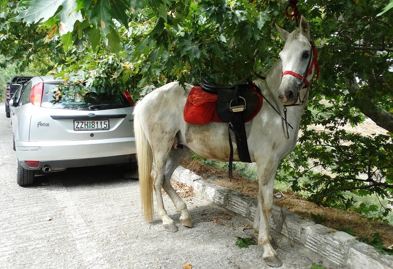 Πάντως μερικοί εξακολουθούν να φτάνουν μέχρι σήμερα εδώ με πραγματικά άλογα. Που τα "παρκάρουν" ανάμεσα στα παρκαρισμένα αυτοκίνητα!!! (φωτ. Εν Άνδρω).