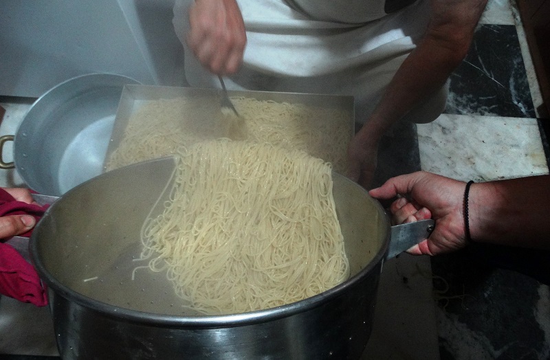 Με το τέλος της σεμνής τελετής της γιορτής ήρθε η ώρα της διάσημης μακαρονάδας του μοναστηριού. Διάσημης όσο και ο Ευδόκιμος που την ταξίδεψε με την σάλτσα του παντού. Μαγειρεύτηκαν 13 κιλά μακαρόνια. Εθελοντές πολλοί... (φωτ. Εν Άνδρω).