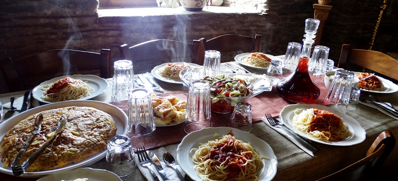Πλούσια τα ελέη του Θευού στο τραπέζι της Μονής την μέρα της γιορτής. Εκτός της μακαρονάδας κόκκινο κρασί ντόπιο και η πατροπαράδοτη ανδριώτικη φουρτάλια με πατάτες και μυρωδικά. Χργσιμοποιήθηκαν 13 κιλά πατάτες. Διέπρεψε ο Μωράκης ως μάγειρας, όπως κάθε χρόνο... (φωτ. Εν Άνδρω)
