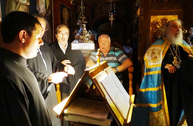Στο ψαλτήρι της λειτουργίας πλήθος ψαλτάδων από παντού. Και ο Ευδόκιμος πάντα στη θέση του πάνω από 60 χρόνια. "Άγκυρα" της μονής και αναφορά όλης της Άνδρου, μαζί με το βυζαντινό μοναστήρι της Παναχράντου, στην Ελλάδα... (φωτ. Εν Άνδρω).