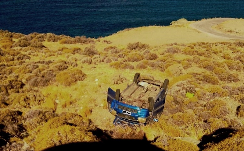 Ευτυχώς το μέρος ήταν ομαλό και η "τούμπα" δεν ήταν τραγική για τους τέσσερις επιβαίνοντες...