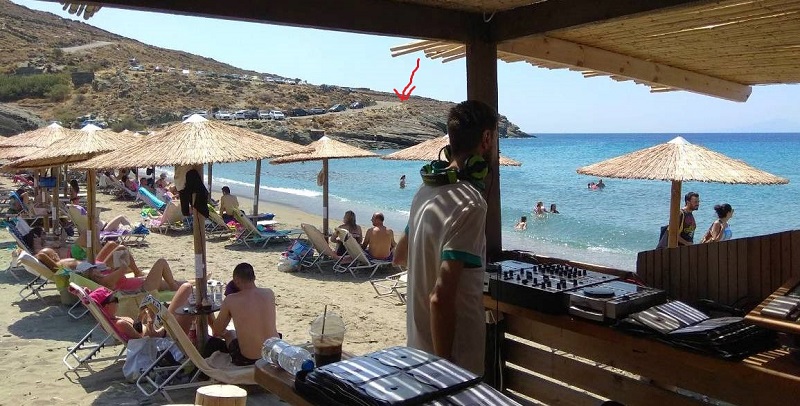 Παραλία Χαλκολιμιώνα: κάποτε ερημική, τώρα κοσμοπολίτικη. Κάτι που σημαίνει και κόσμο και ανέσεις όπως βλέπουμε. Διακρίνονται τα παρκαρισμένα αυτοκίνητα και με κόκκινο βέλος το σημείο που έπεσε κι αναποδογύρισε το αμάξι...