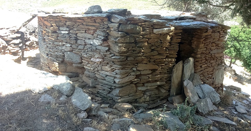 Το εσωτερικό του εξωκλησιού. Απομένει η αρμολόγηση του. Η στέγη από μονοκόμματες πλάκες. Το δάπεδο του επίσης από παραδοσιακές πέτρες έμεινε όπως ήταν (φωτ. Εν Άνδρω).