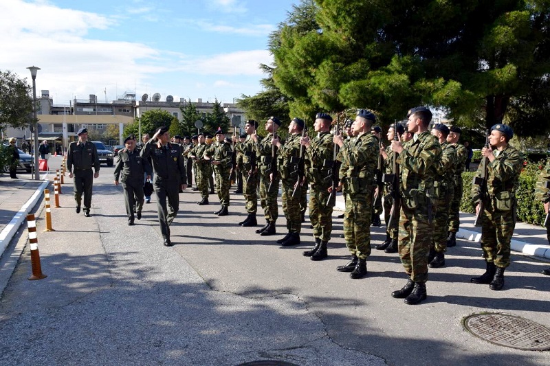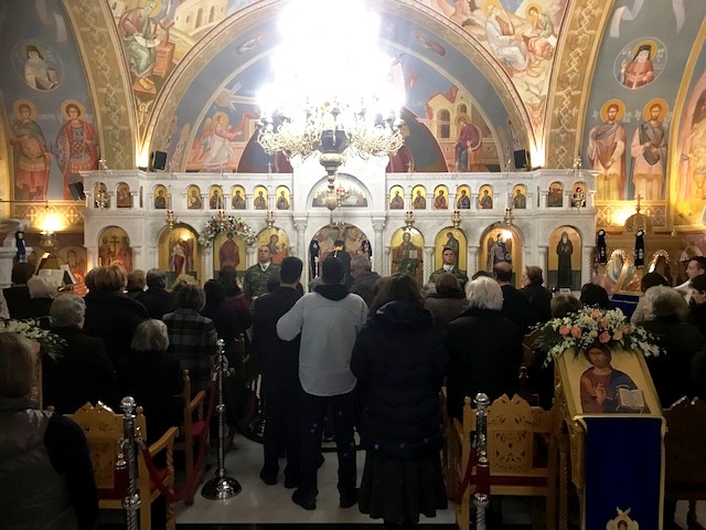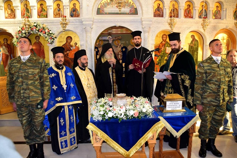 Τιμητικό άγημα υποδέχεται τον γέροντα Ευδόκιμο με την κάρα και τους μοναχούς από Άνδρο