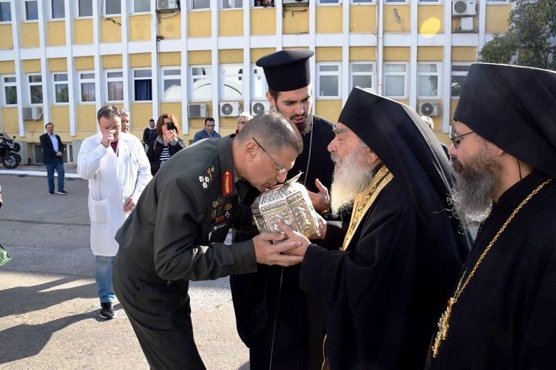 Η υποδοχή του Αγίου έγινε το μεσημέρι της Παρασκευής 23 Νοεμβρίου 2018 παρουσία του αρχηγού του στρατού Αντιστράτηγου Αλκιβιάδη Στεφανή, του διοικητού του νοσοκομείου Υποστράτηγου Τάκου Παναγιώτου, του υπόδιοικητού Α Μανουσαρίδη Σάββα και των λοιπών αξιωματικών και τιμητικού αγήματος.