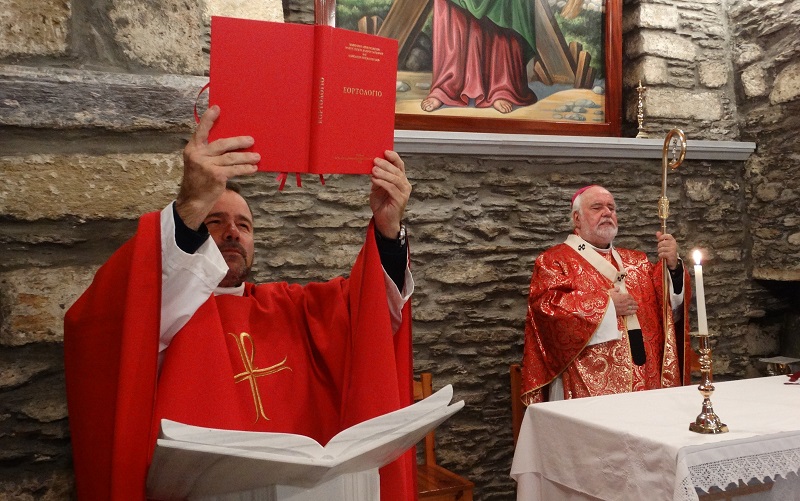 Ιστορικά τα πράγματα αντεστράφησαν όταν η Άνδρος στασίασε και έδιωξε τον τελευταίο Βενετό διοικητή τον 16ο αιώνα και προσχώρησε στην Οθωμανική Αυτοκρατορία. Τότε ήταν οι καθολικοί που γνώρισαν μεγάλη πίεση γιατί οι Οθωμανοι έδωσαν προνόμια στους Ορθόδοξους και εδίωκαν τους Καθολικούς ώστε να μην υπάρχουν επιρροές από την Βενετία. Κάπως έτσι άρχισε η ραγδαία αποδυνάμωση της καθολικής κοινότητας Άνδρου που μέχρι τότε αριθμούσε δεκάδες εκκλησίες σε όλο το νησί. Στη φωτογραφία ο πατέρας Φραγκίσκος ολοκληρώνει την ανάγνωση του Ευαγγελίου στην διάρκεια της χτεσινής λειτουργίας (φωτ. Εν Άνδρω).