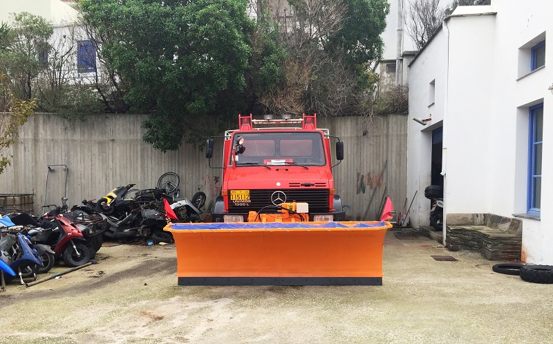 Ο ΣΕΔΑ της Άνδρου έχει δύο "μαχαίρια" για το χιόνι. Και είναι και τα δύο τοποθετημένα και έτοιμα για παν ενδεχόμενο, καθώς ο ουρανός έχει βαρύνει και οι πρώτες κρύες ψιχάλες έχον αρχίσει λίγο μετά το μεσημέρι.