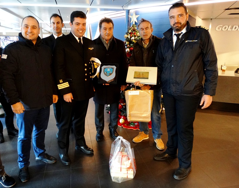 Έμαθε προφανώς και ο δήμαρχος τα της υποδοχής και ήρθε με την παρέα του. Το τοπικό πρόεδρο Κ. Μούλα, τον δημοτικό σύμβουλο Ν. Βιδάλη (που έπαιρνε φωτογραφίες). Έφερε μαζί του και δώρο. Το ιστορικό βιβλίο του Δημήτρη Πολέμη: "Τα Ιστιοφόρα της Άνδρου". Ευχάριστο γεγονός που ήρθε, αν και επί τέσσερα χρόνια ξεχνούσε την υποδοχή του πρώτου πλοίου. Όμως τώρα ήρθε (ίσως γιατί είναι προεκλογική χρονιά). Αλλά έστω κι έτσι καλό ήταν που ήρθε. Στη φωτογραφία ο καπετάν Θανάσης Χαλάς στο σαλόνι του πλοίου δέχεται τα δώρα: την πλακέτα του λιμενάρχη, το βιβλίο του δημάρχου και τα γλυκά του Λάσκαρη (φωτ. Εν Άνδρω).