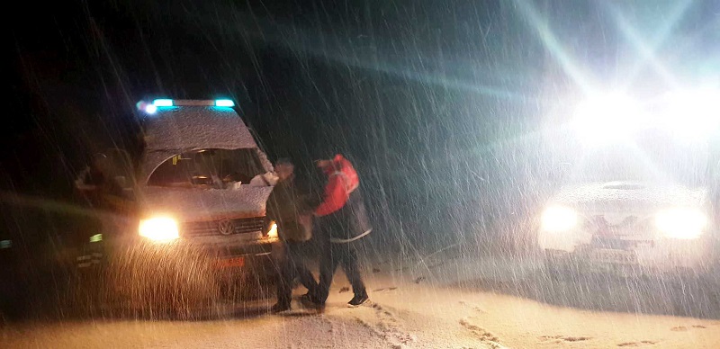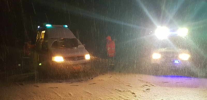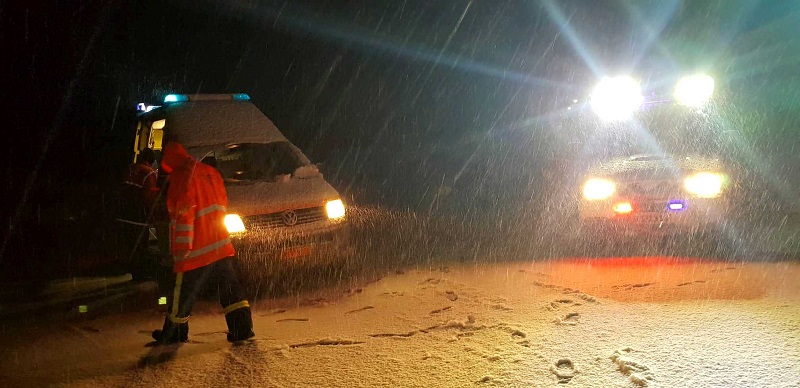 Επειδή όλοι οι δρόμοι ήταν αποκλεισμένοι η Πυροσβεστική μετέφερε τον ασθενή ηλικιωμένο, που είχε φύγει από το σπίτι του και είχε χαθεί στην θύελλα, στη Μεσαριά όπου κατάφερε το ασθενοφόρο και ήρθε από το Κέντρο Υγείας. Στη φωτογραφία το ασθενοφόρο και το τζιπ της Πυροσβεστικής στην Μεσαριά απόψε.