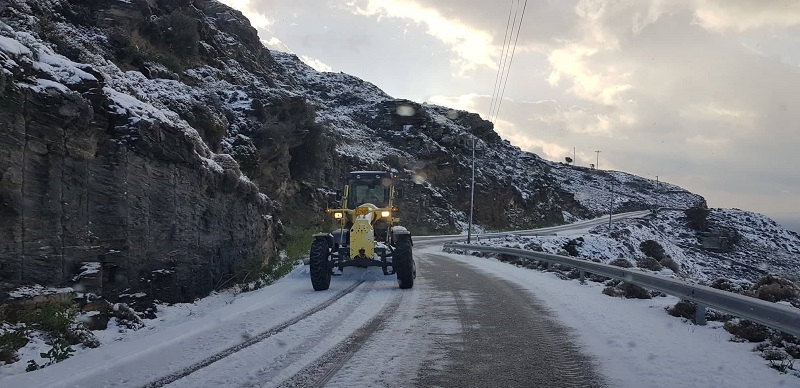 Το γκρέιντερ του Δήμου Άνδρου. Ο κεντρικός δρόμος είναι βατός, σε αρκετά σημεία όμως με παγετό.