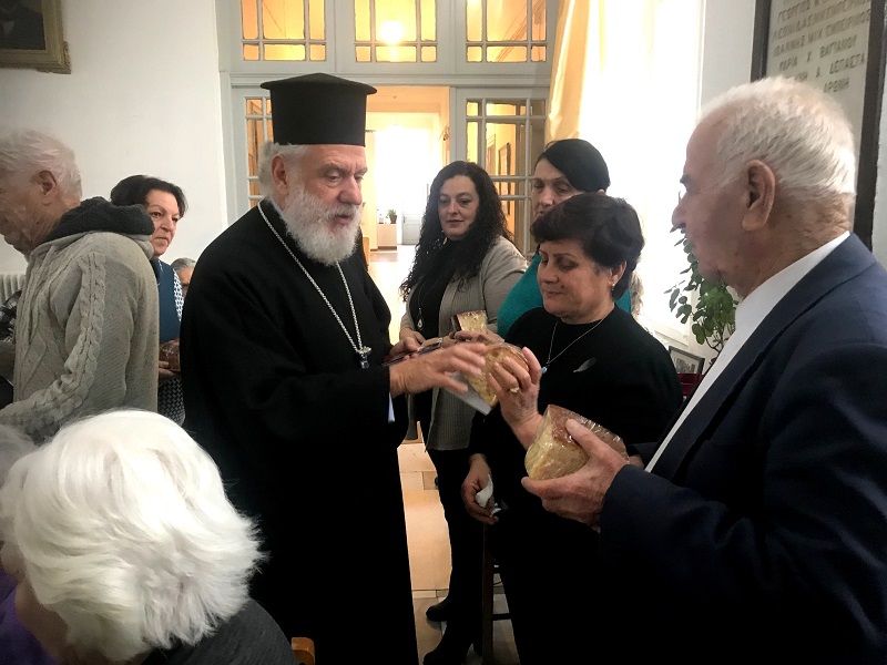 Ο μητροπολίτης μοιράζει τα κομμάτια της πίτας στους παρισταμένους. Να σημειώσουμε πως ο μητροπολίτης. η αδελφότητα της Παναχράντου και οι άλλοι ιερείς συνέφαγαν ακολούθως μαζί με τους γέροντες στην τραπεζαρία του Γηροκομείου (φωτ. Χαρίδημος).