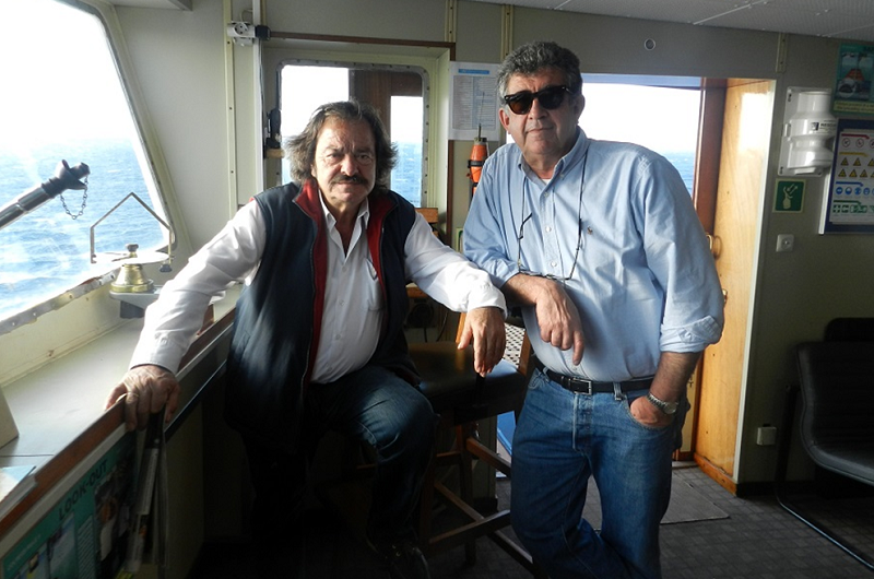 Ο καπετάν Γιαννούλης Χαζάπης (δεξιά) καπετάνιος του Χαρούλα. Εδώ στην γέφυρα του Superferry II με τον καπετάν Τάσο Τρέσο (αριστερά) (φωτ. Εν Άνδρω).