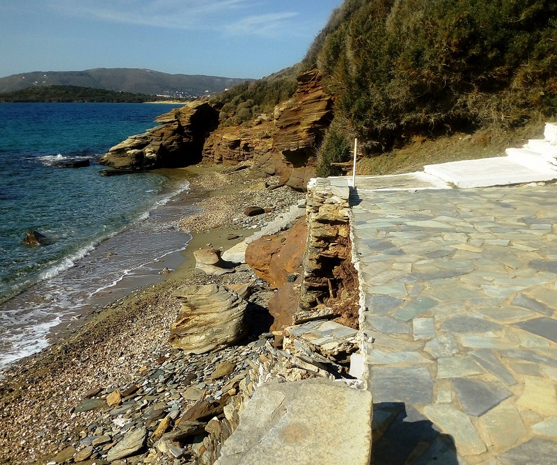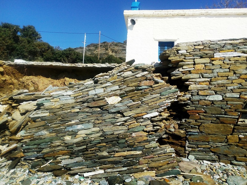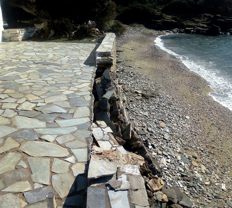 Η μικρή αυλή μπροστά στην είσοδο της εκκλησίας όπου γίνονται τα καλοκαιρία οι περισσότεροι γάμοι στο νησί, χρειάζεται επιθεώρηση και άμεση αποκατάσταση, καθώς τα κύματα «έφαγαν» ένα σημείο της βάσης της αυλής. Και με μια επόμενη μεγάλη κακοκαιρία έτσι εκτεθειμένη που είναι σήμερα η όλη κατασκευή μπορεί να έχουμε πολύ χειρότερα.