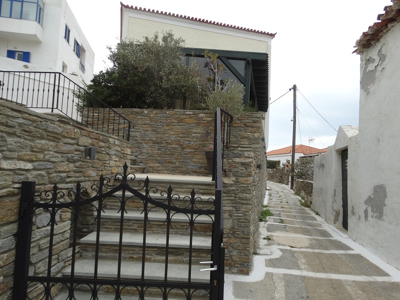 Πνιγμένο μέσα στα σπίτια το παλιό επιβλητικό ξενοδοχείο. "Ξέρεις", συνεχίζει ο Γιάννης, "στη δεκαετία του 1950 ήταν το πρώτο που απέκτησε εστιατόριο και ήταν, όπως γράφουν, πόλος έλξης όλης της Άνδρου. Λειτούργησε μέχρι το 1988. Εδώ έκανε διακοπές ο Ανδρέας Εμπειρίκος, που δεν είχε σπίτι στο νησί, παρέα με τον Οδυσσέα Ελύτη και τον Μ. Καραγάτση. Αλλά και άλλους διάσημους της εποχής. Ήταν το Χίλτον της εποχής του για την Άνδρο. Μέχρι που έκλεισε..." (φωτ. Εν Άνδρω).