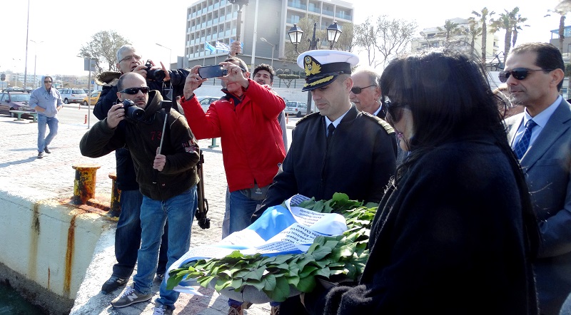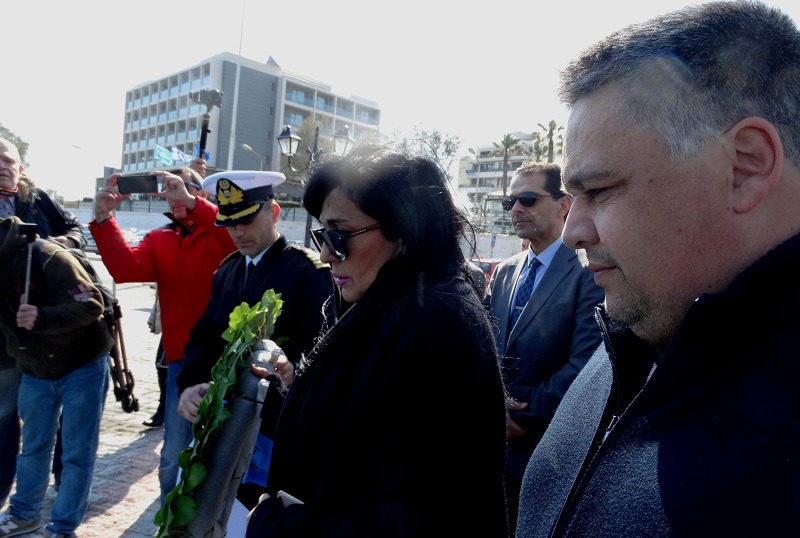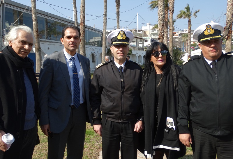 Μετά το μνημόσυνο στην προκυμαία για την ρίψη στεφάνου στη θάλασσα. Διακρίνονται ο λιμενάρχης Ραφήνας, η διευθύνουσα σύμβουλος του ΟΛΡ, ο πρόεδρος του ΟΛΡ και ο έπαρχος Άνδρου (φωτ. Εν Άνδρω).