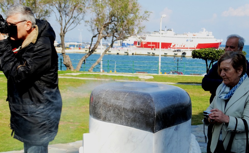 Μετά το μνημόσυνο στην προκυμαία για την ρίψη στεφάνου στη θάλασσα. Διακρίνονται ο λιμενάρχης Ραφήνας, η διευθύνουσα σύμβουλος του ΟΛΡ, ο πρόεδρος του ΟΛΡ και ο έπαρχος Άνδρου (φωτ. Εν Άνδρω).