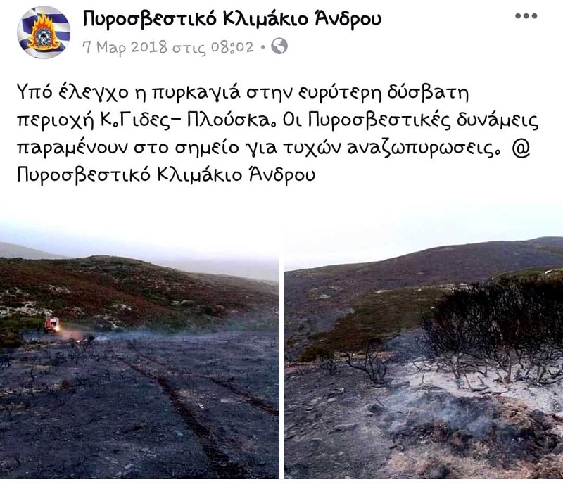 Να σημειώσουμε πως η περιοχή έχει καεί αρκετές φορές για παράνομη βόσκηση. Και για όποιον δεν το πιστεύει πέρσι την ίδια μέρα και ίδια ώρα γράφαμε στο Εν Άνδρω για πυρκαγιά στην ευρύτερη περιοχή της Πλούσκας. Πλέον καταλαβαίνουμε πως αυτοί που βάζουν τις φωτιές στα απάτητα της Άνδρου τηρούν με ακρίβεια και χρονοδιάγραμμα και ωράριο!!