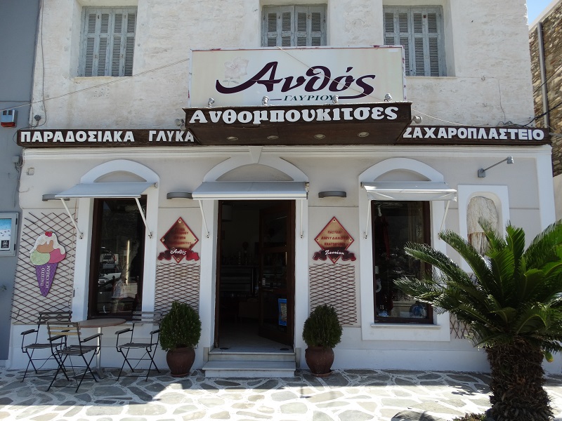 Πήρα μερικές φωτογραφίες του νέου καταστήματος που φτιαχνότανε και μετά περπάτησα πίσω στον σημερινό «Ανθό Γαυρίου». Την περίμενα να επιστρέψει. Μέχρι να ‘ρθει τράβηξα μερικές φωτογραφίες του λιμανιού και του παλιού ζαχαροπλαστείου. Και θυμήθηκα το περιστατικό για το οποίο έχω γράψει στο Εν Άνδρω.